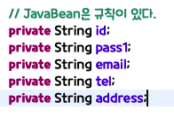 위 내용과 관련된 자바 클래스를 만드는것이다. jsp와 데이터베이스 간의 데이터를 쉽게 주고받게 하기위한 개념이 자바 빈이다.