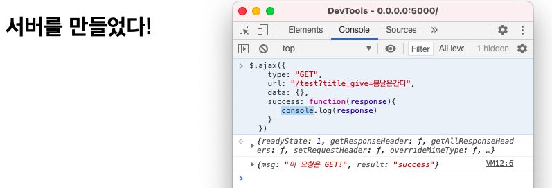 그럼 서버는 응답하는데, 가만보면 서버의 url이 "/test?title_give=봄날은간다"로 되어있다.